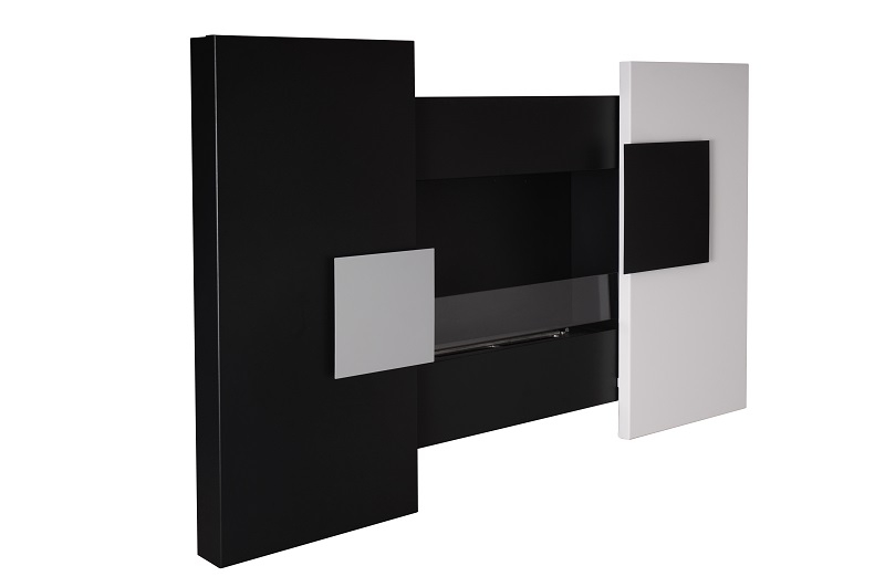- Дизайнерское панно превращается в современный биокамин благодаря системе раздвижных дверок, скользящих по слайдам на шарикоых подшипниках.