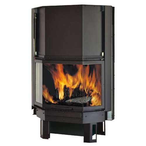 Призматическая топка. Закрытая топка со стальным корпусом и широким обзором огня. Эркерное составное огнеупорное стекло. Очаг с чугунной футеровкой. Плавный подъем дверцы-гильотины. Топка может устанавливаться как с пристенной облицовкой, так и в угловой версии камина.