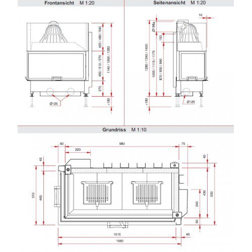 Каминная топка Schmid Ekko L/R 10045 h для угловых каминов, с цельным, угловым стеклом. Дверца топки открывается вверх, а также в сторону для чистки стекла.