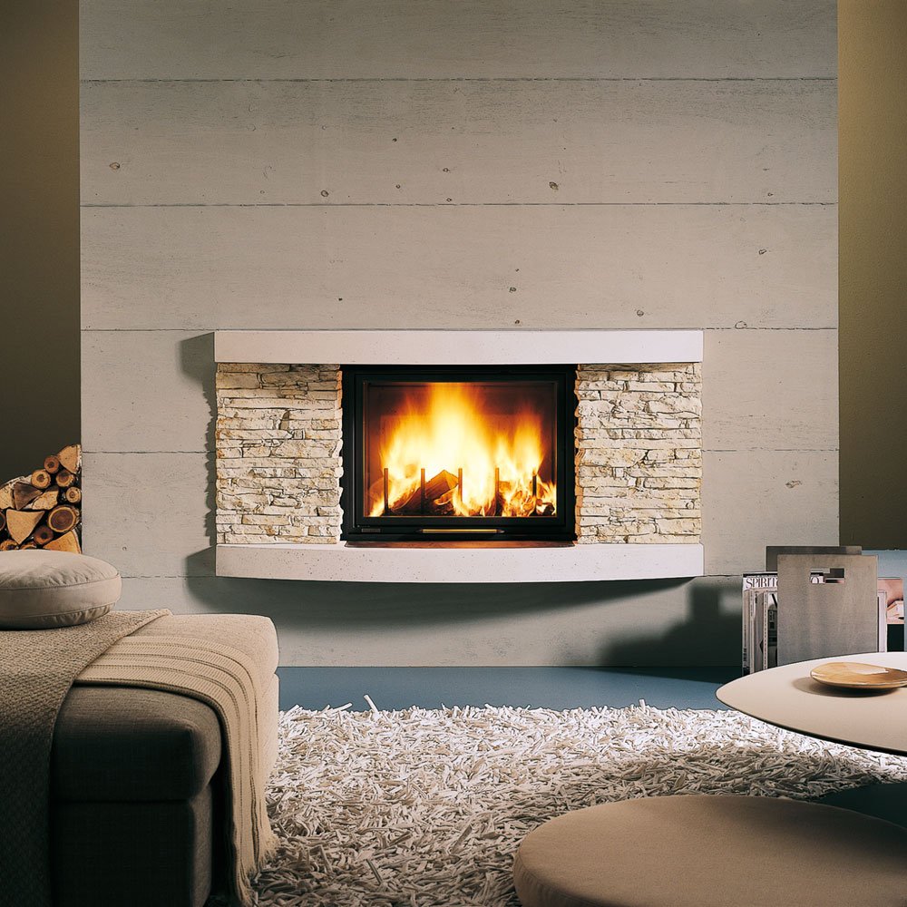 Боковины из декоративного материала, окрашенного с помощью натуральных оксидов для эффекта натурального камня, положенного всухую. Панели сверху и снизу из неокрашенного материала и могут быть окрашены по вашему вкусу. Стальная защитная поверхность напротив топки.