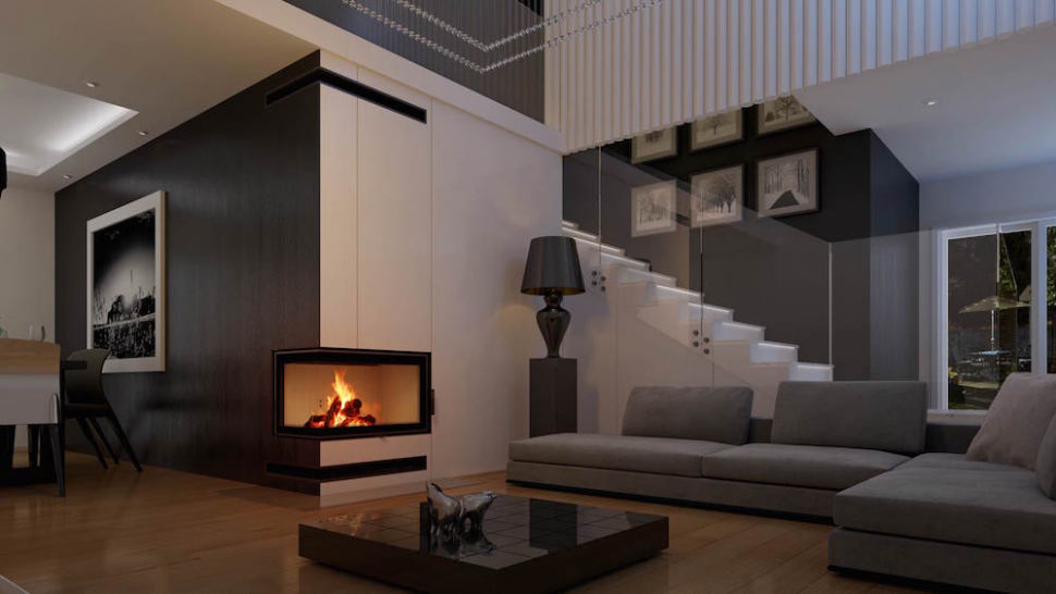 - Каминная топка с двумя стеклянными панелями, сопоставленными друг напротив друга под прямым углом (стеклянные панели соединены без рамы).